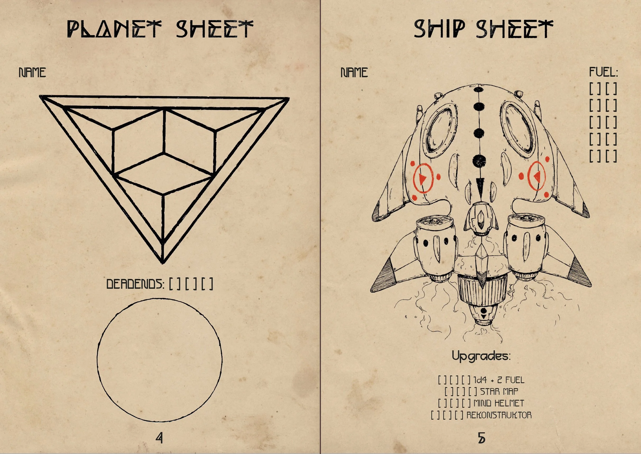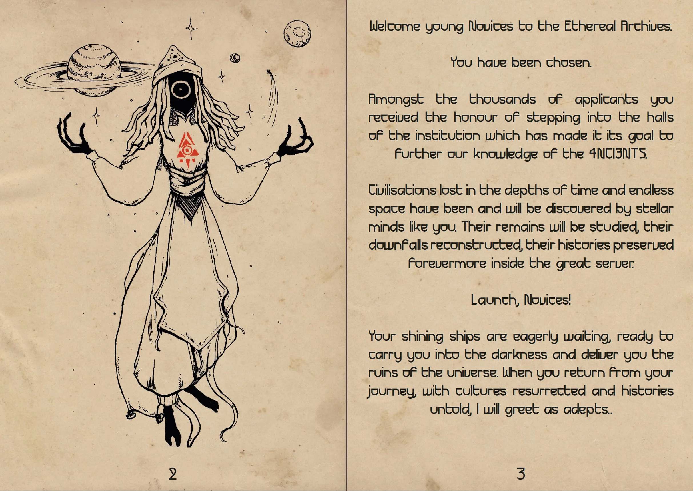 My part for “4NCI3NTS” focused both on illustration and graphic design. Max wanted the world of his game to be inspired by old school sci-fi illustrations and be less about technical advancements and more about mystique, magic and a certain kind of warmth and whimsy, even in the technical aspects like the space-ship and the triangle symbols the player needs to fill out.